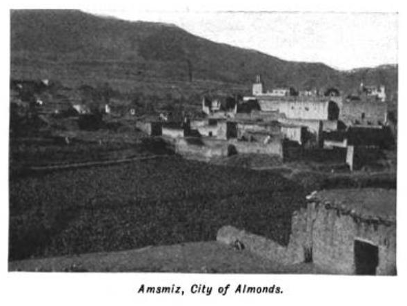 “Away to the south-west [of Marrakech], just as the great [Atlas] range lifts itself above the burning plain, lies Amsmiz, the city of almonds, nestling amid its groves of perfume and colour, and showing on its battered barbicans traces of political differences with the dynasty, or with some robber tribe from the hills. History is not my theme, and I care not which. But the remains of the struggle are picturesque” (58).